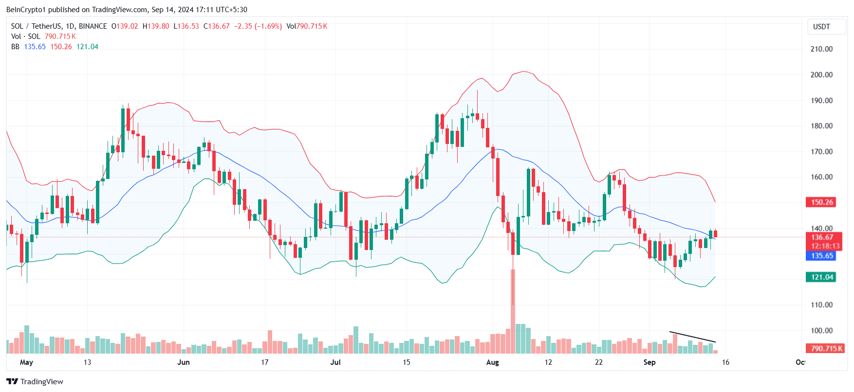 The market sentiment around Solana is currently leaning bullish, as the Bollinger Bands are tightening, a pattern that often signals a potential price rise. The candlesticks are positioned above the baseline of the Bollinger Bands, indicating upward momentum building in SOL.