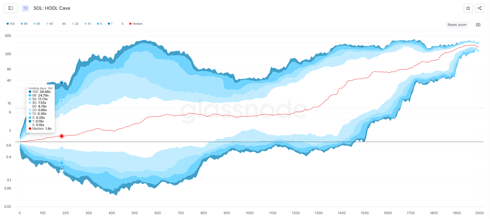 The HODL Cave metric sheds light on the motivation behind this selling trend. Contrary to profit-taking behavior, data suggest these investors are driven by fear rather than greed. The median return for holders in the three- to six-month range sits between 1.14x and 1.4x, modest gains that imply panic selling rather than strategic exits.