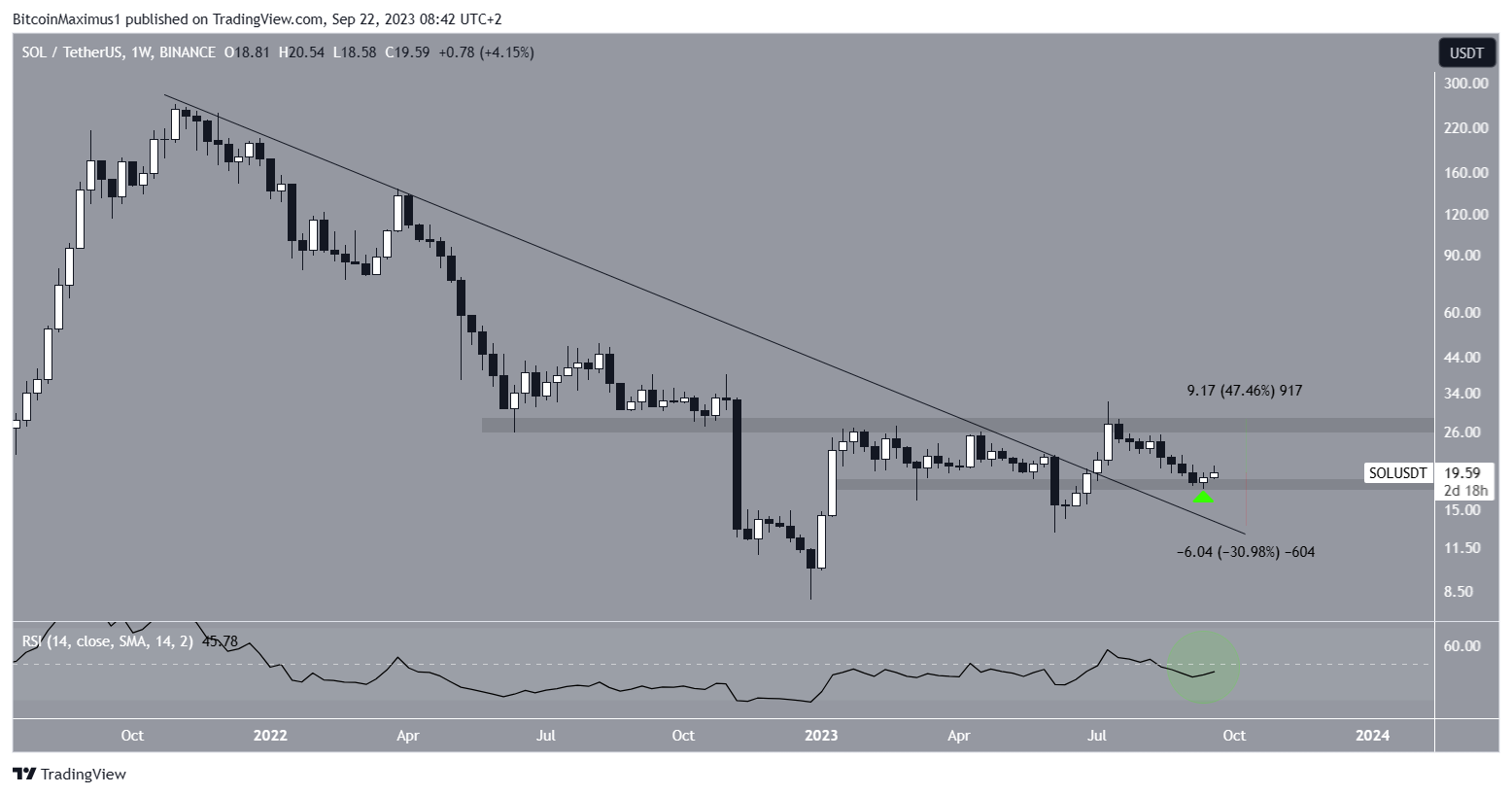 The technical analysis from the weekly time frame shows that the SOL price has fallen since its yearly high of $32.13 in July. The decrease culminated with a low of $17.33 on Sept. 11.