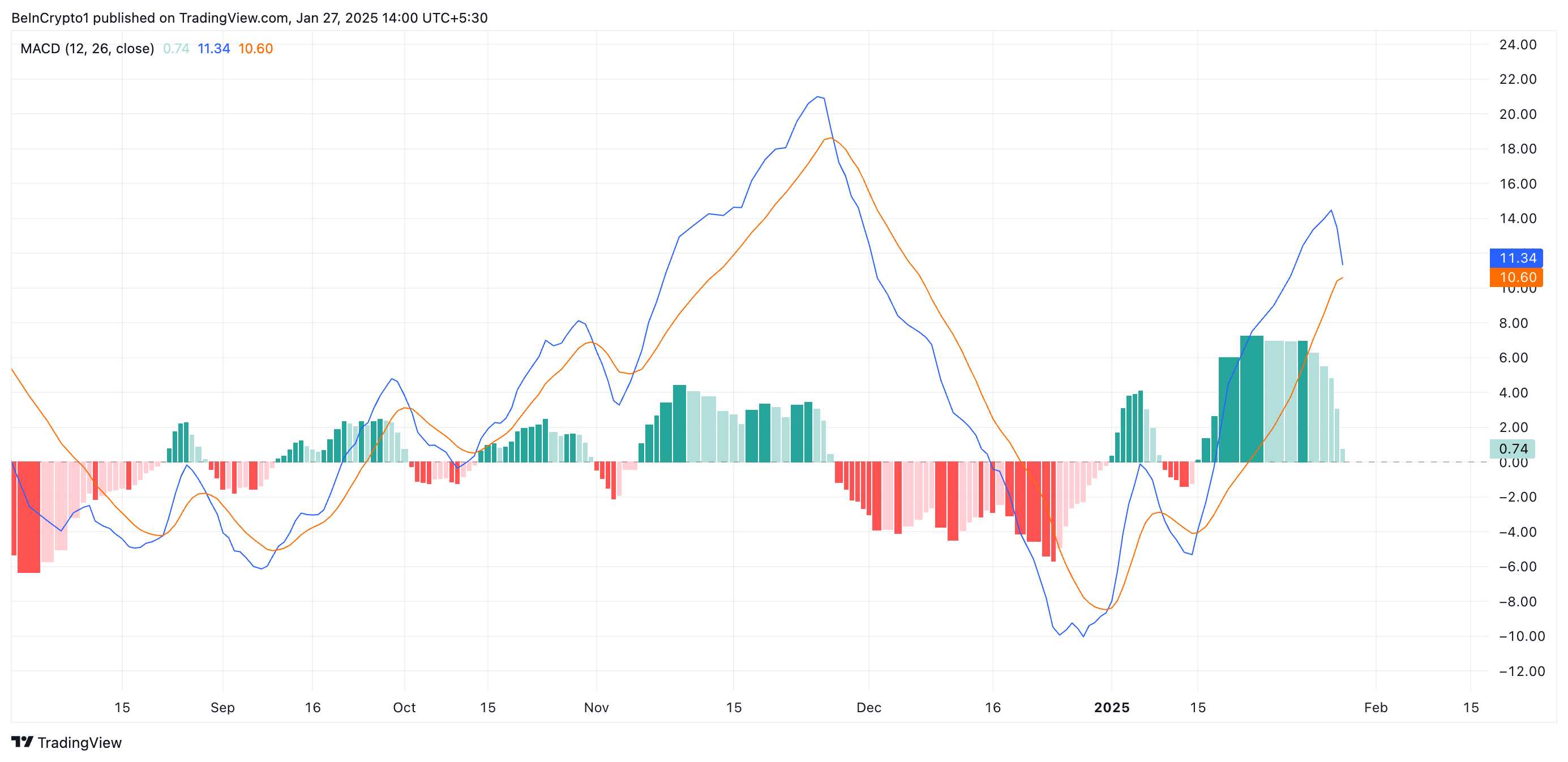 When an asset’s MACD is set up this way, it suggests a bearish crossover, indicating that selling momentum is building, hinting at a sustained price drop.