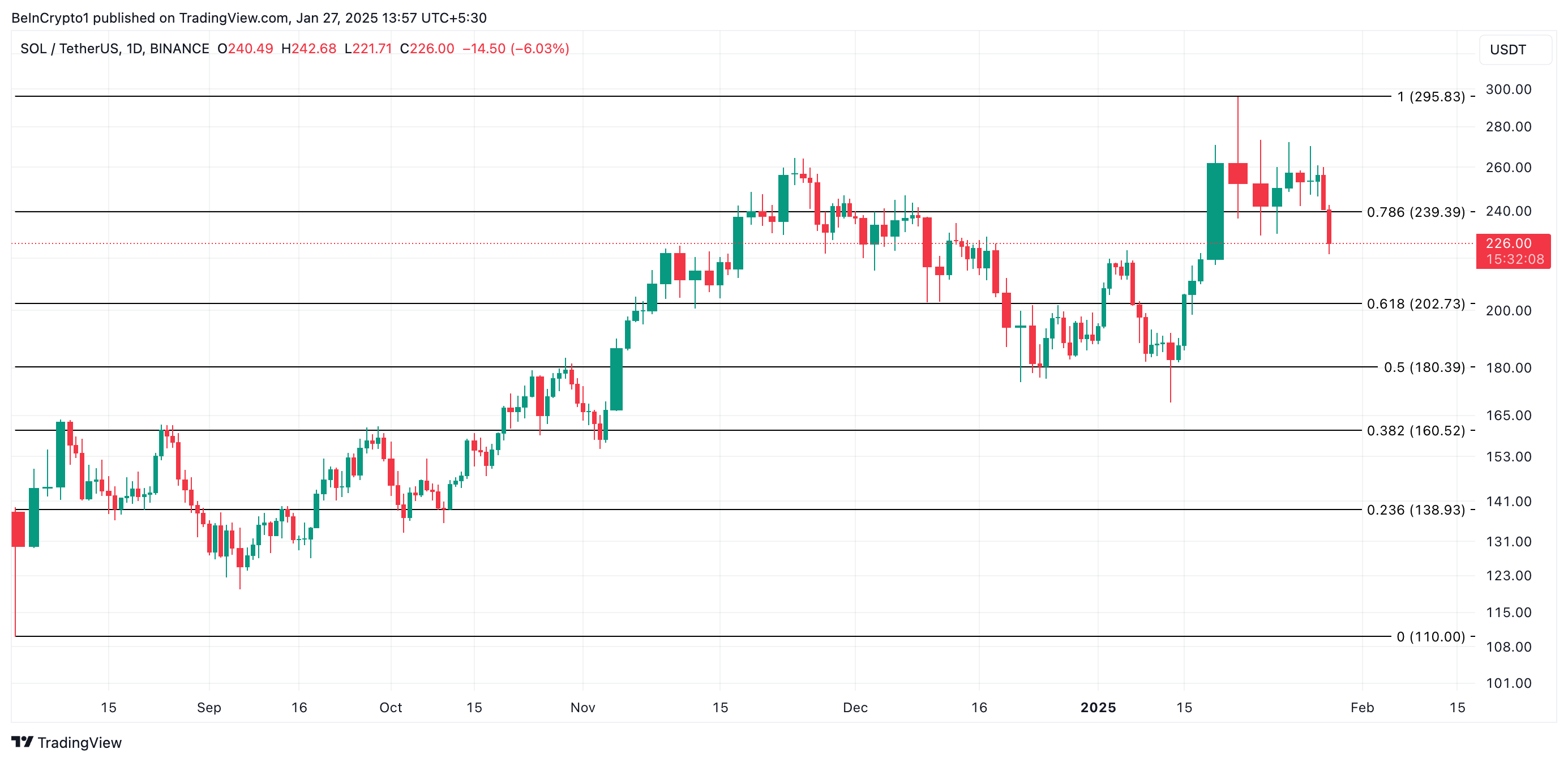 Solana (SOL) has been on a downward trend since reaching an all-time high of $295.83 on January 19. The altcoin currently trades at $226, declining 23% from its peak.