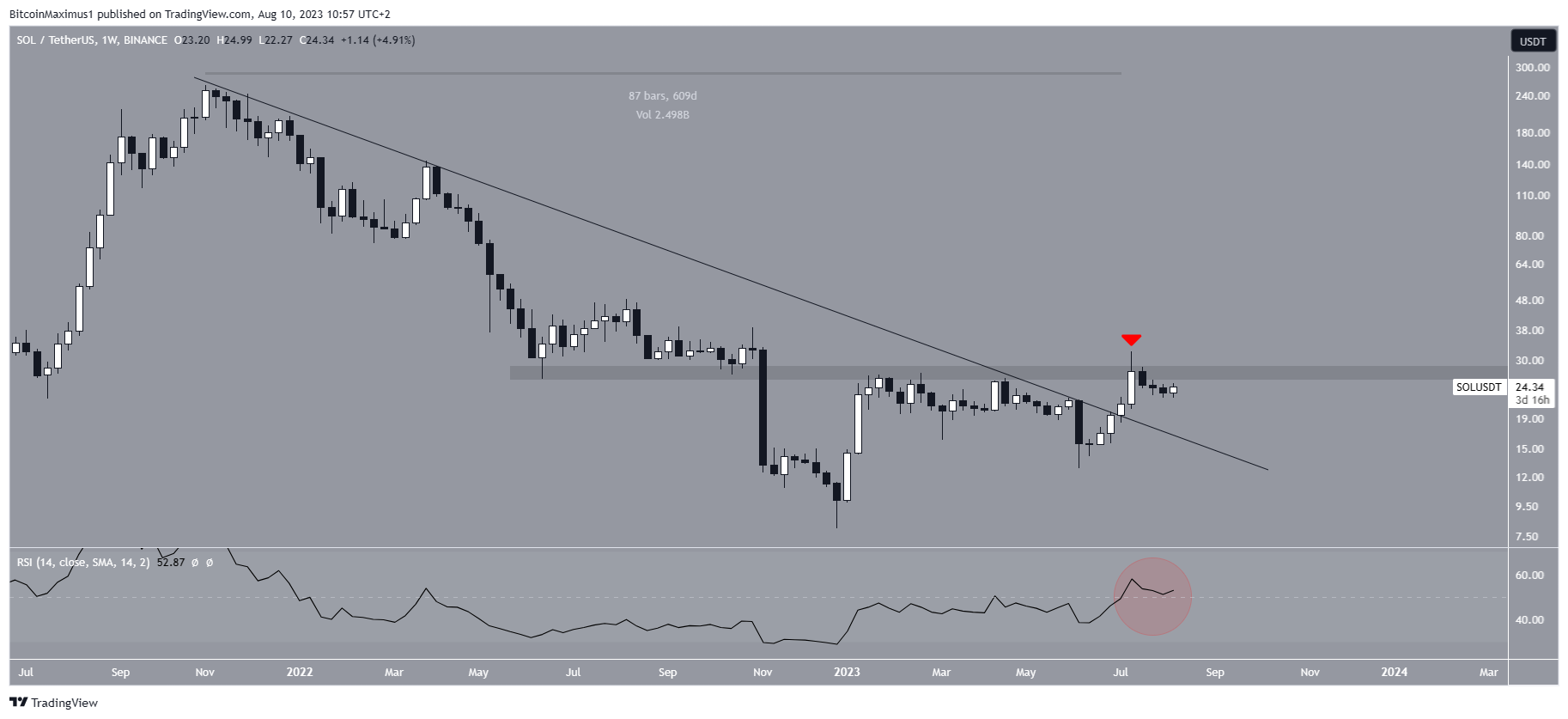The weekly time frame technical analysis shows that the SOL price broke out from a long-term descending resistance line in July. The line had previously been in place for 609 days, tracing the downward movement since the all-time high in November 2022.