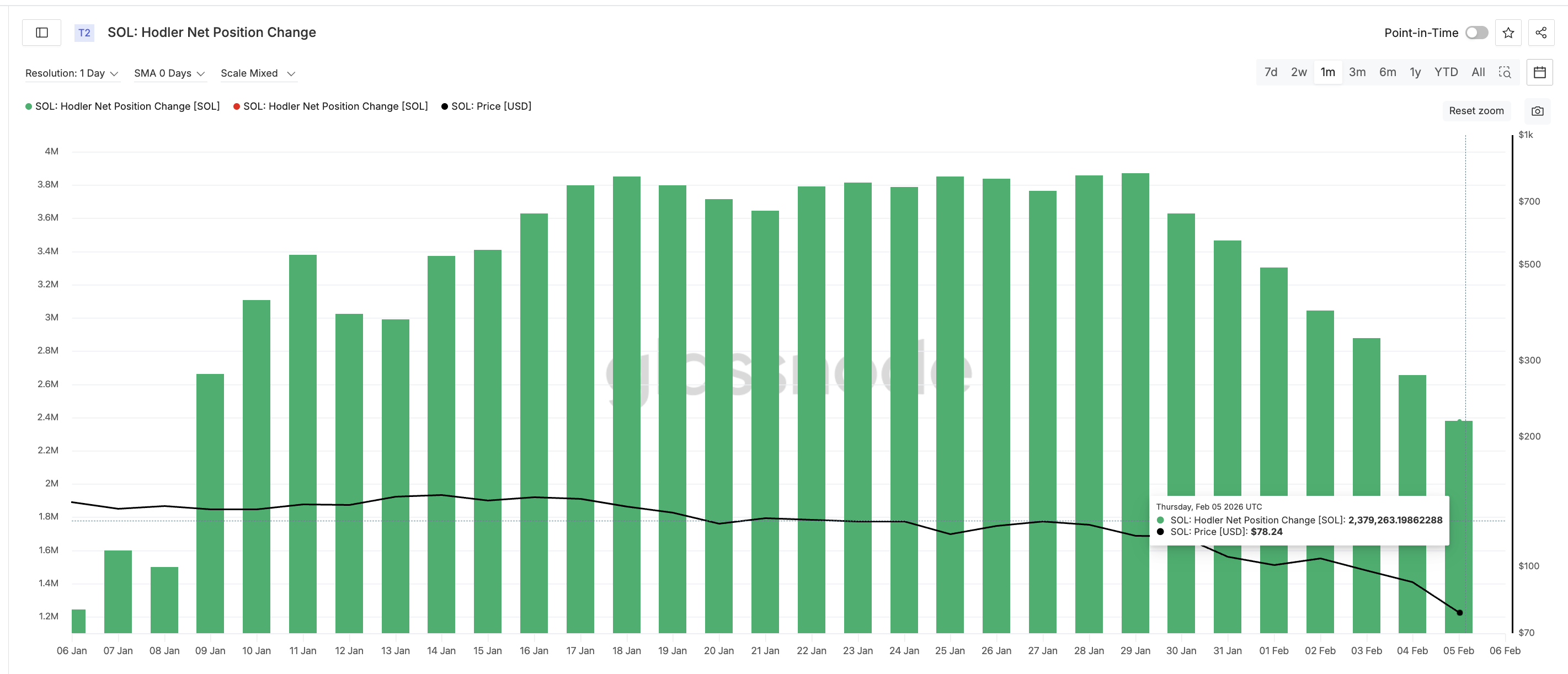 SponsoredAt the same time, long-term holders continue to reduce exposure. The Hodler net position change metric, which tracks long-term investor holdings, has declined from approximately 2.87 million SOL on February 3 to around 2.37 million SOL by February 5. A 17% dip in two days, amid the dip.