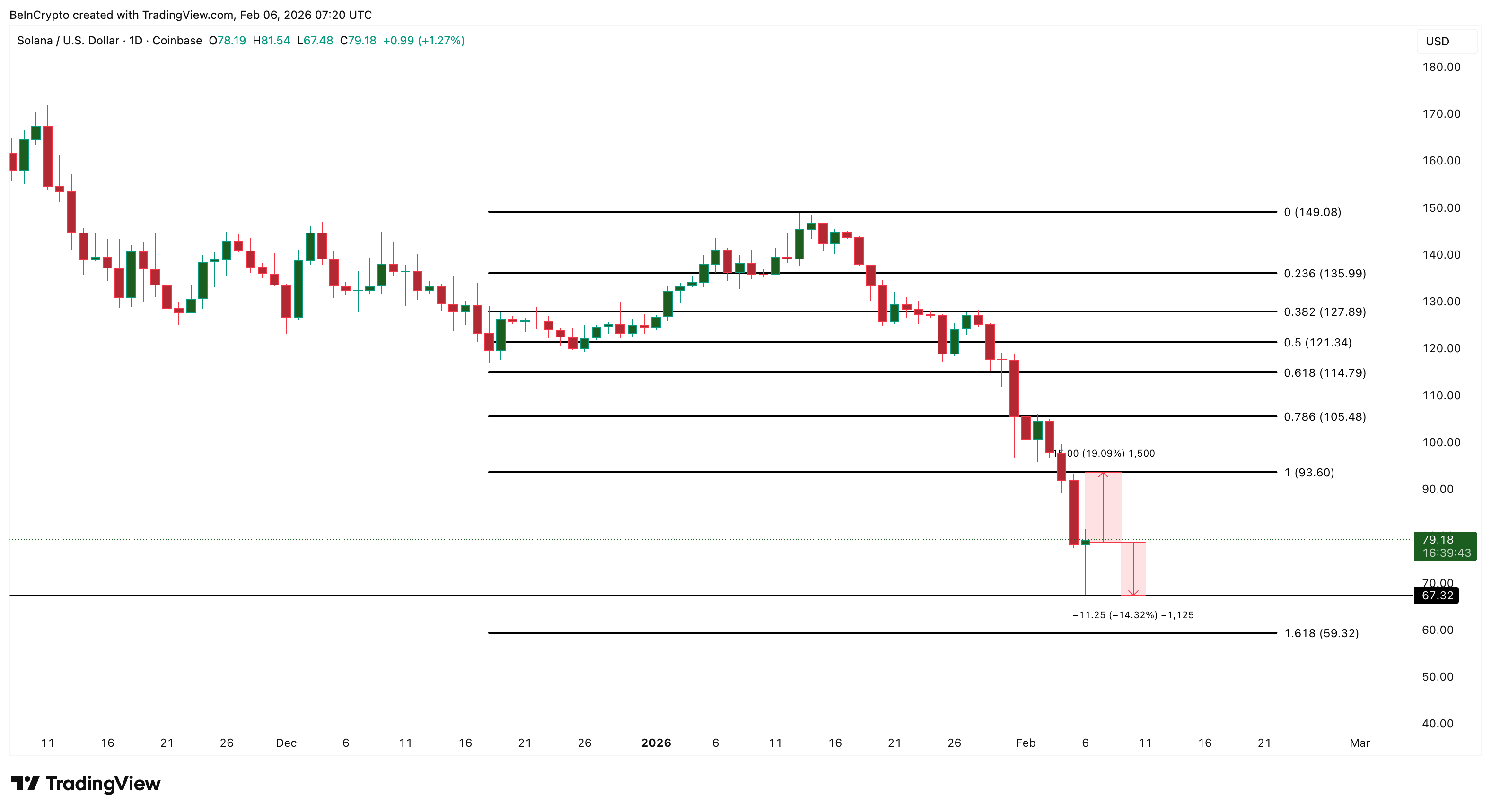 Solana’s price has staged a sharp rebound after one of its steepest declines. After breaking down from its descending channel on February 4, SOL plunged nearly 30% to around $67. Since then, the token has recovered more than 15%, climbing back toward the $78 region.