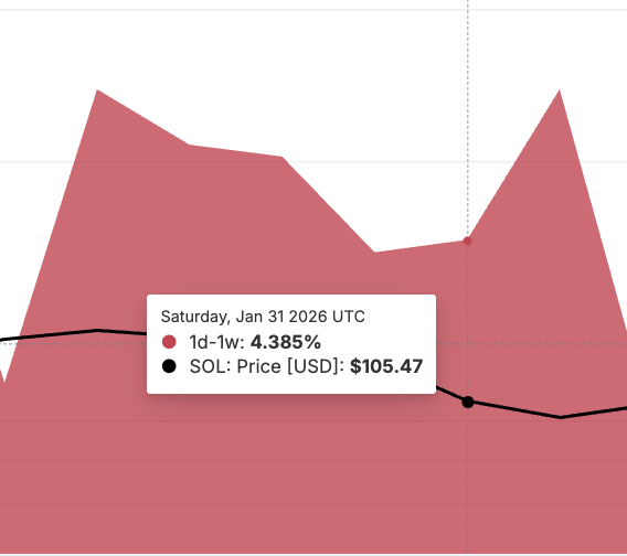 A similar pattern appeared in late January. On January 27, short-term holders controlled around 5.26% of the supply. By January 31, their share had dropped to 4.38% as they sold into weakness. During that period, Solana’s price fell from around $127 to $105, a roughly 17% decline.