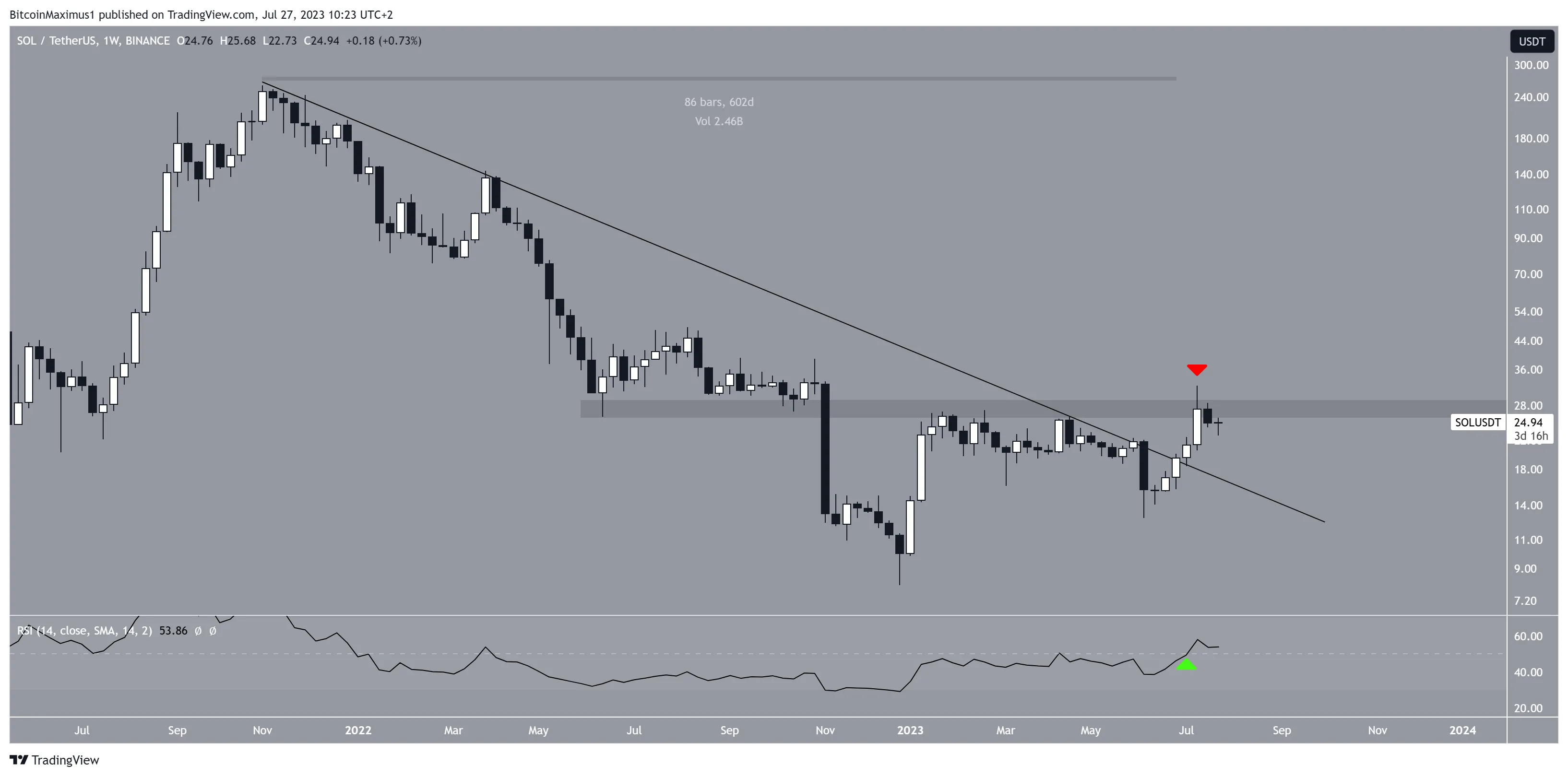An examination of SOL’s weekly time frame reveals a notable event that occurred three weeks ago. During this time, SOL broke through a downward resistance line that had been active since November 2021, spanning over 600 days.
