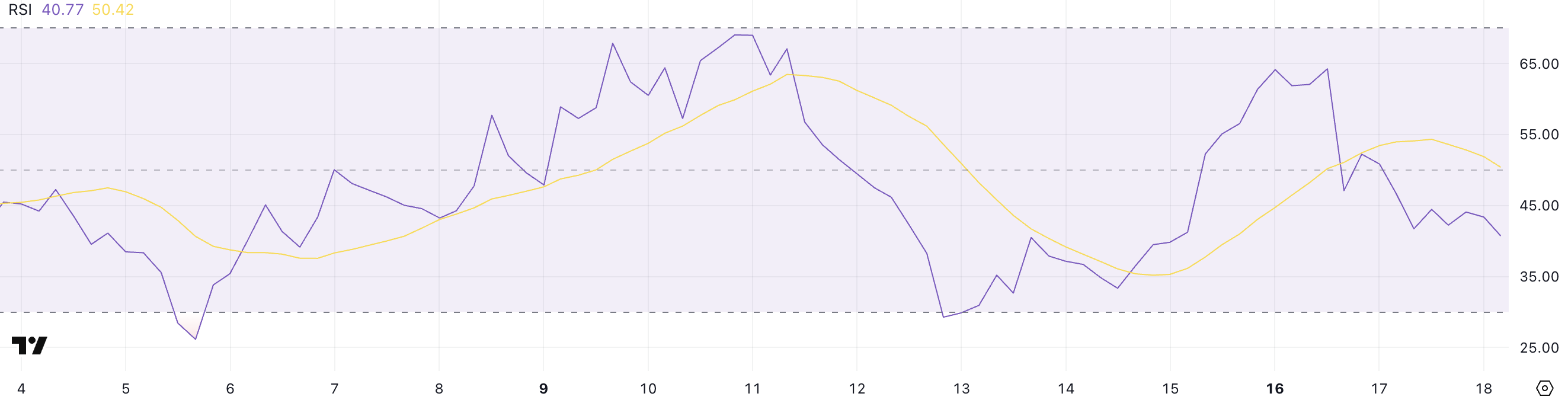 A reading near 40.77 places Solana in a neutral-to-weak zone, hinting that the asset is losing upward momentum but hasn’t yet reached oversold territory.