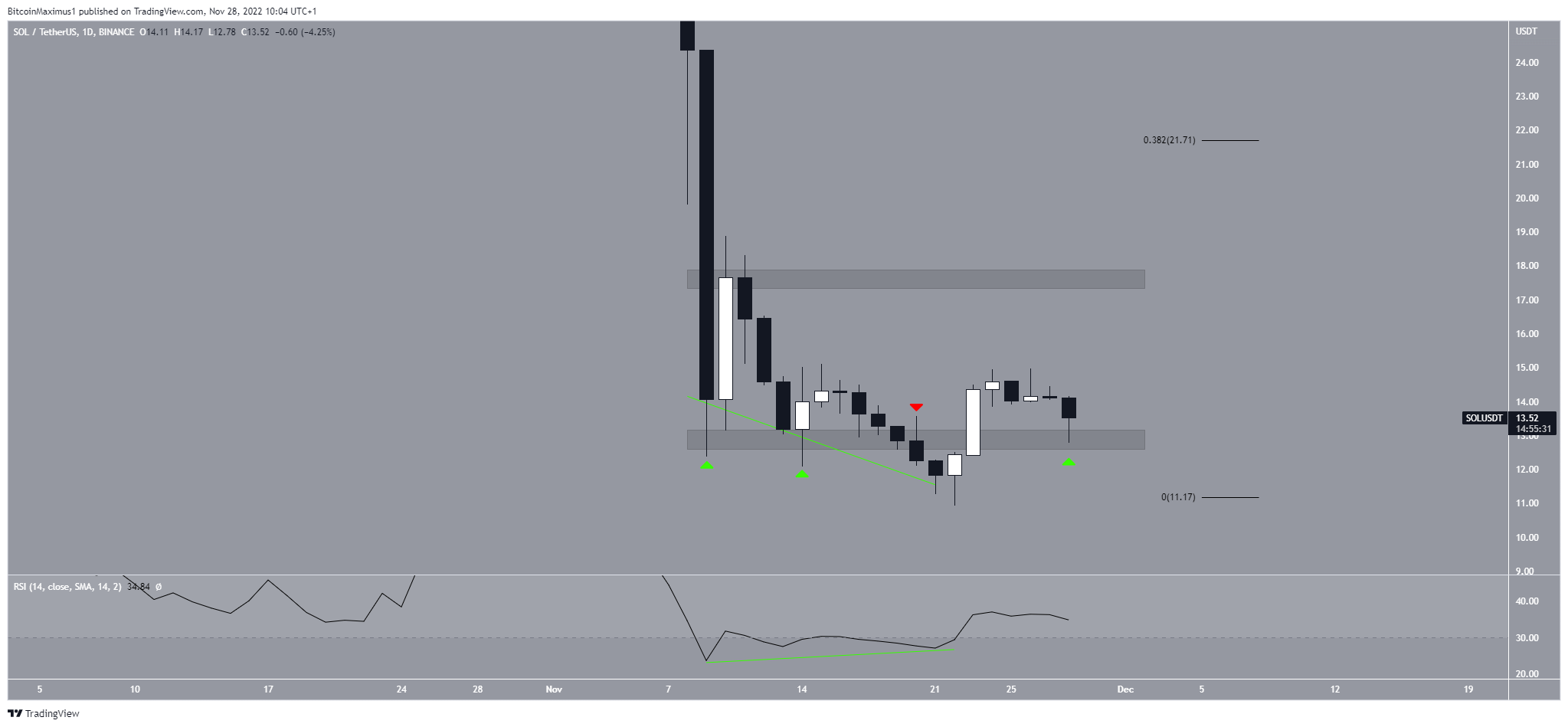 The reclaim was preceded by bullish divergence in the daily RSI (green line). As a result, the trend can be considered bullish as long as the trend line is still intact, and the SOL price is trading above the $13 area.