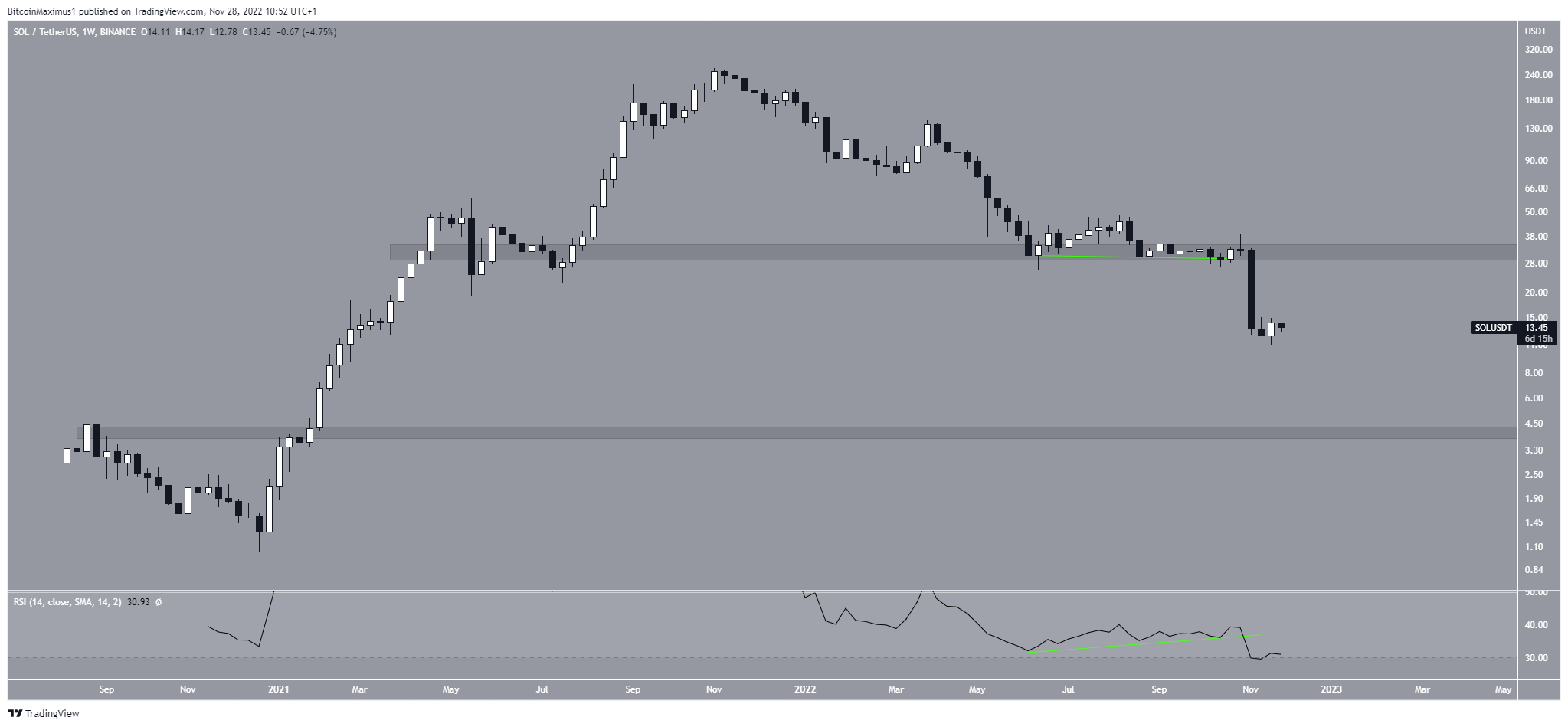 As a result, the long-term Solana price prediction is considered bearish until the $32 area is reclaimed. The next closest support area has an average price of $4.