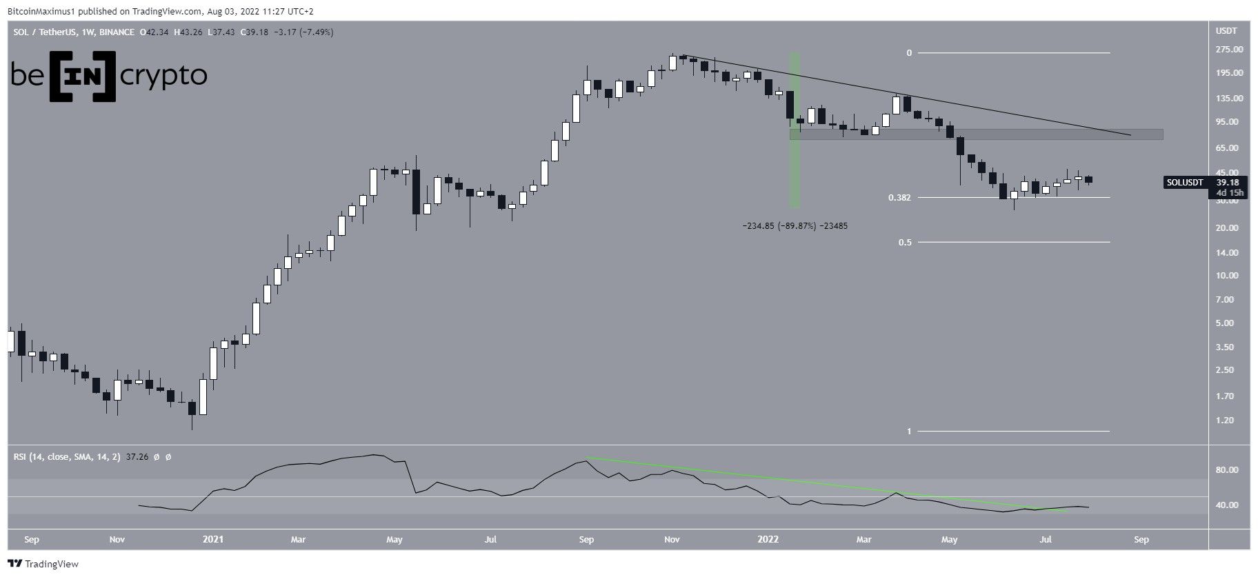 SOL has been falling since reaching an all-time high price of $259 in Nov. The downward movement has so far led to a low of $25.86 last month. This was a decrease of 90% when measuring from the all-time high price.Â