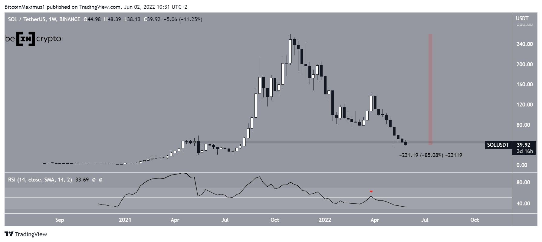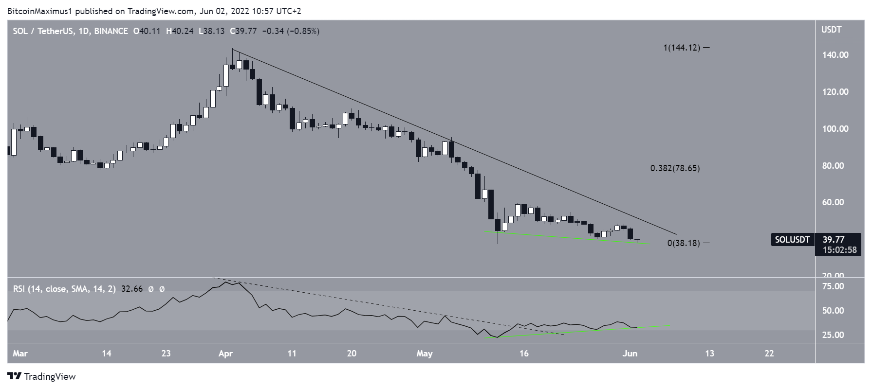 SOL has been falling since reaching an all-time high price of $258.6 on Nov 6. The price initially bounced in the beginning of March, but has been falling since April 2.Â