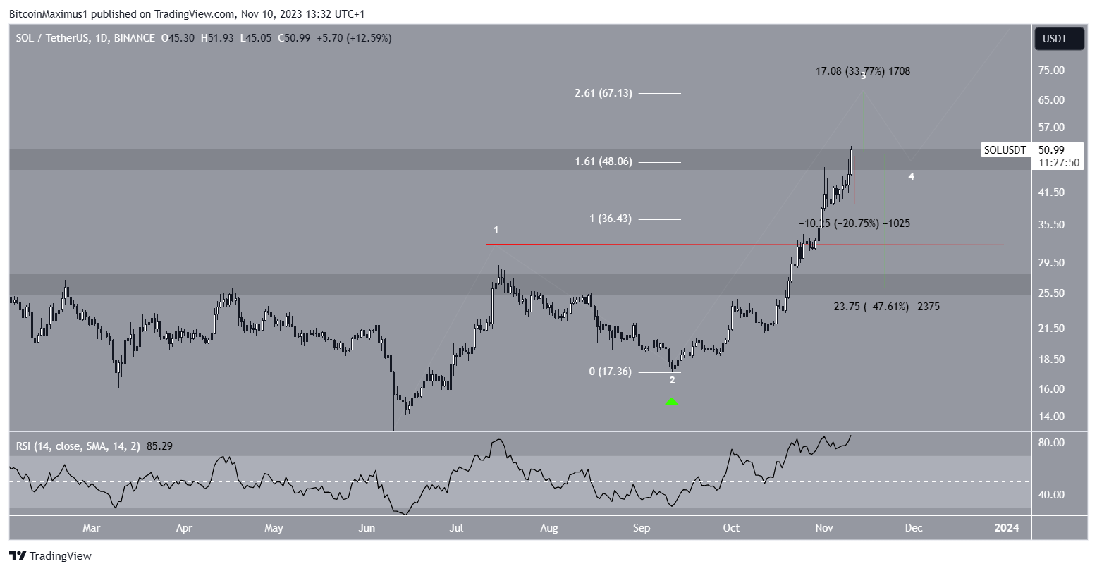 The daily time frame count supports the continuing increase. It suggests that SOL is in wave three of a five-wave upward movement (white). Wave three is often the sharpest and longest out of the bullish waves.