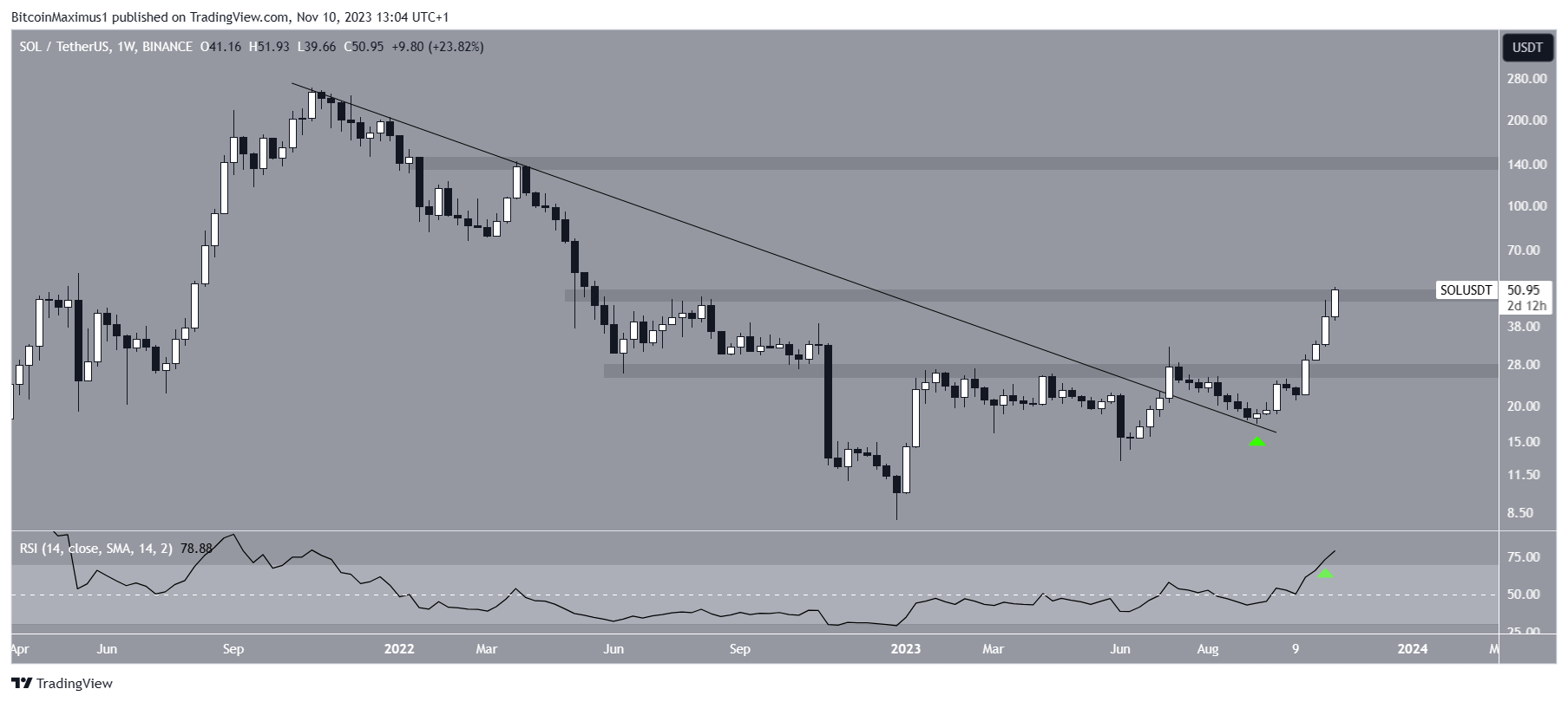 The rally has been sharp, and the SOL price has not experienced any retracement. During the upward movement, the SOL price increased above the $27 resistance area. It is now increasing above the $50 resistance area. While SOL moved above it, it has yet to reach its weekly close.