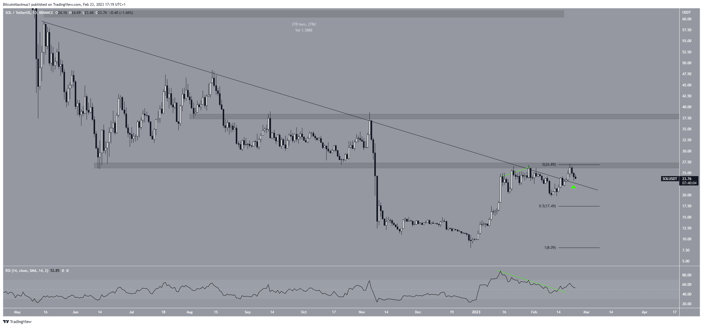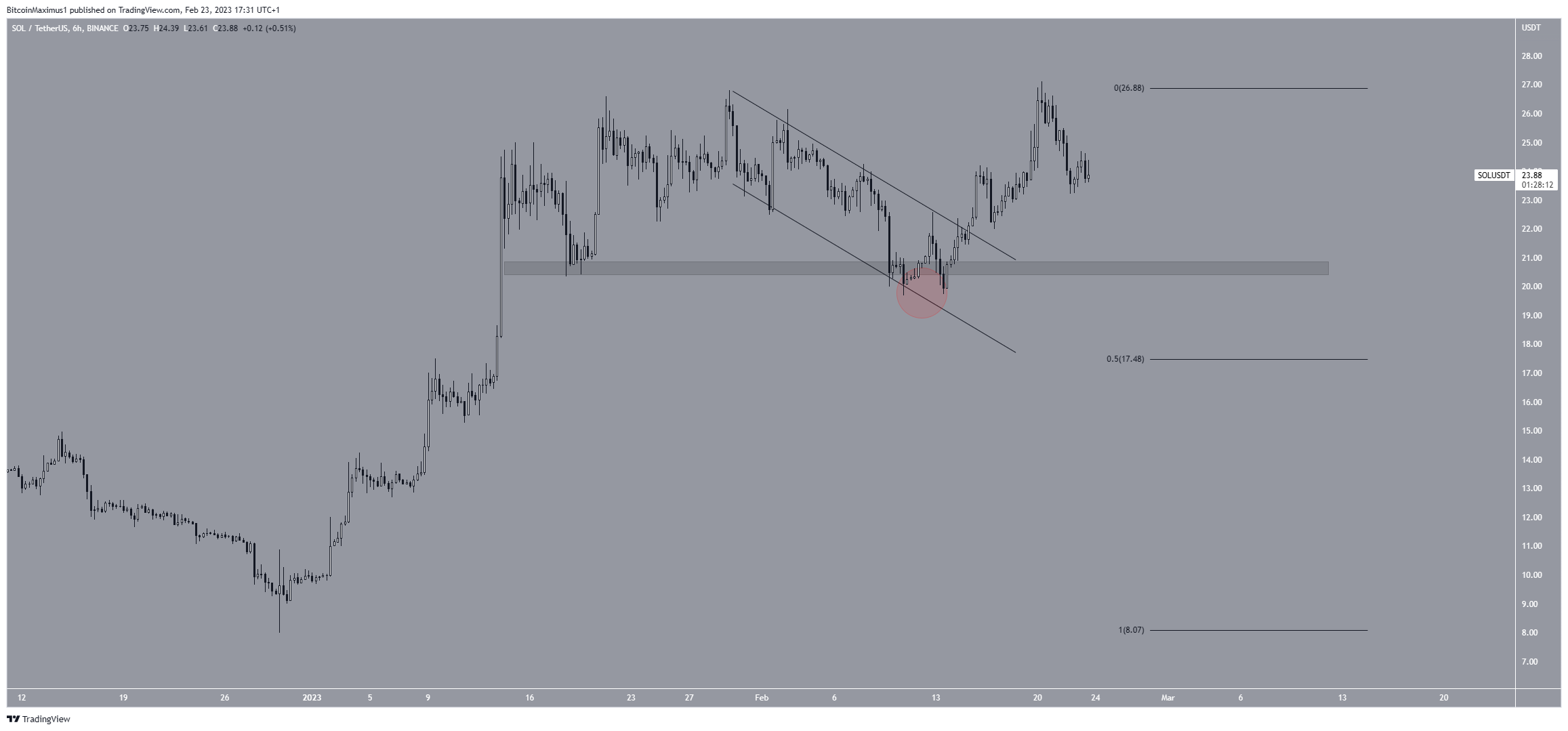 After four unsuccessful attempts, the SOL token price broke out from the descending resistance line on Feb. 18 2023. While it did not move above the $28 resistance area, it validated the resistance line as support (green icon).