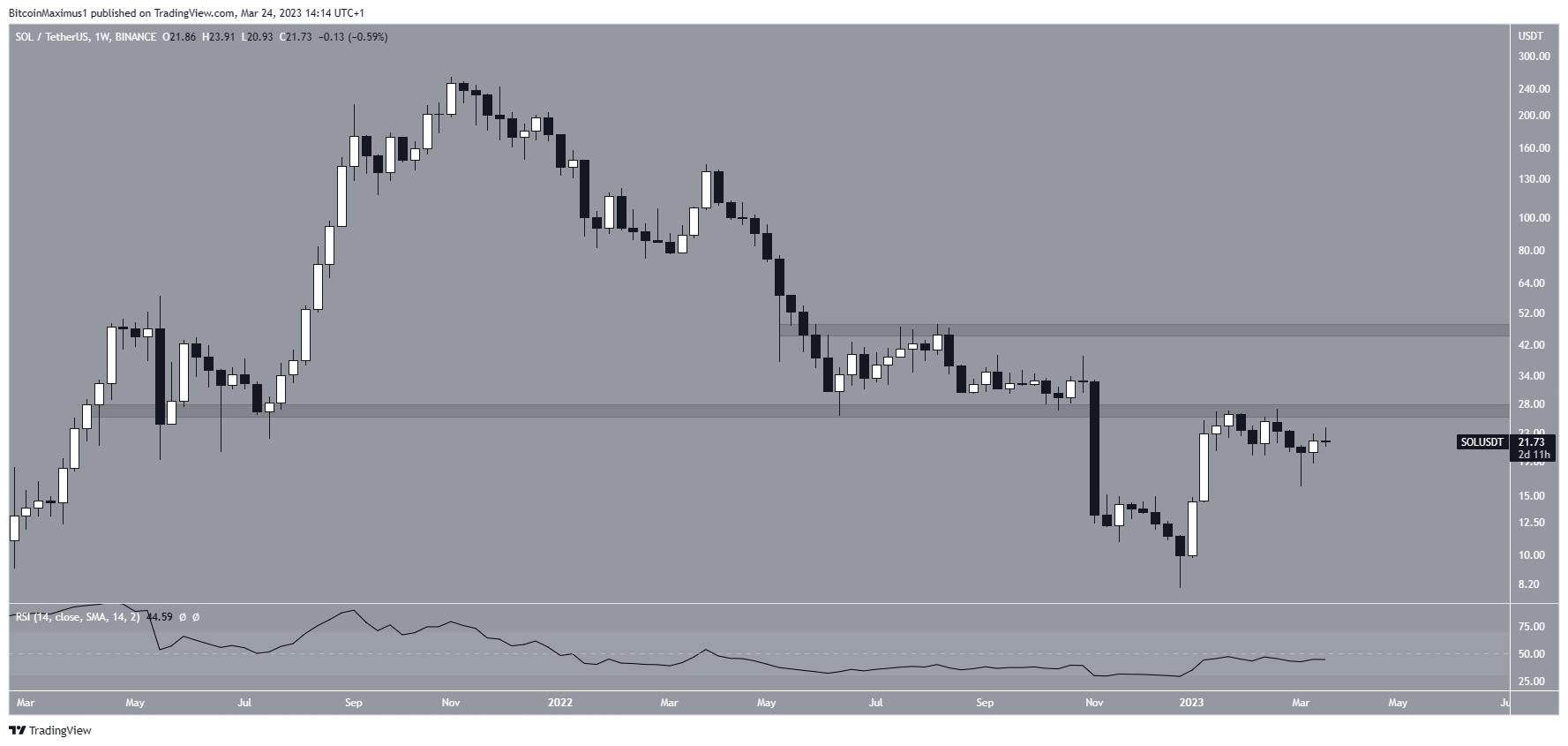 SOL, which is the native cryptocurrency of the Solana blockchain, has fallen since reaching an all-time high of $259.90 in November 2021. The downward movement culminated with a low of $8 in December 2022. However, the price began a massive rally afterward and is currently trading at $21.73.
