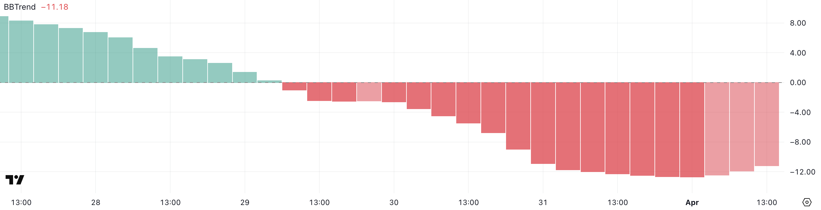 Values below -10 typically indicate strong bearish pressure, while values above +10 reflect strong bullish momentum. A rising BBTrend from deep negative territory can be an early sign of a potential reversal or at least a slowdown in the downtrend.