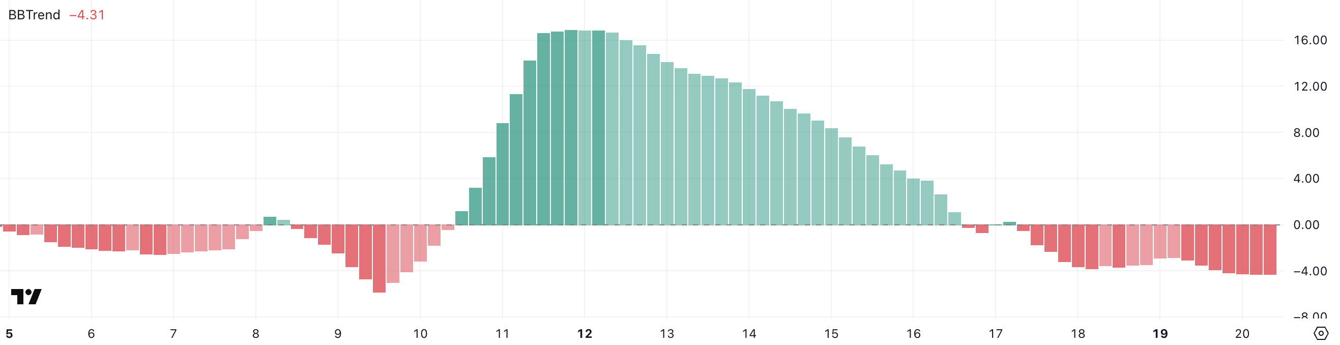 Values above 0 typically indicate bullish momentum, while values below 0 signal bearish momentum. A BBTrend at -4.31 reflects strong downward pressure and limited volatility expansion to the upside.