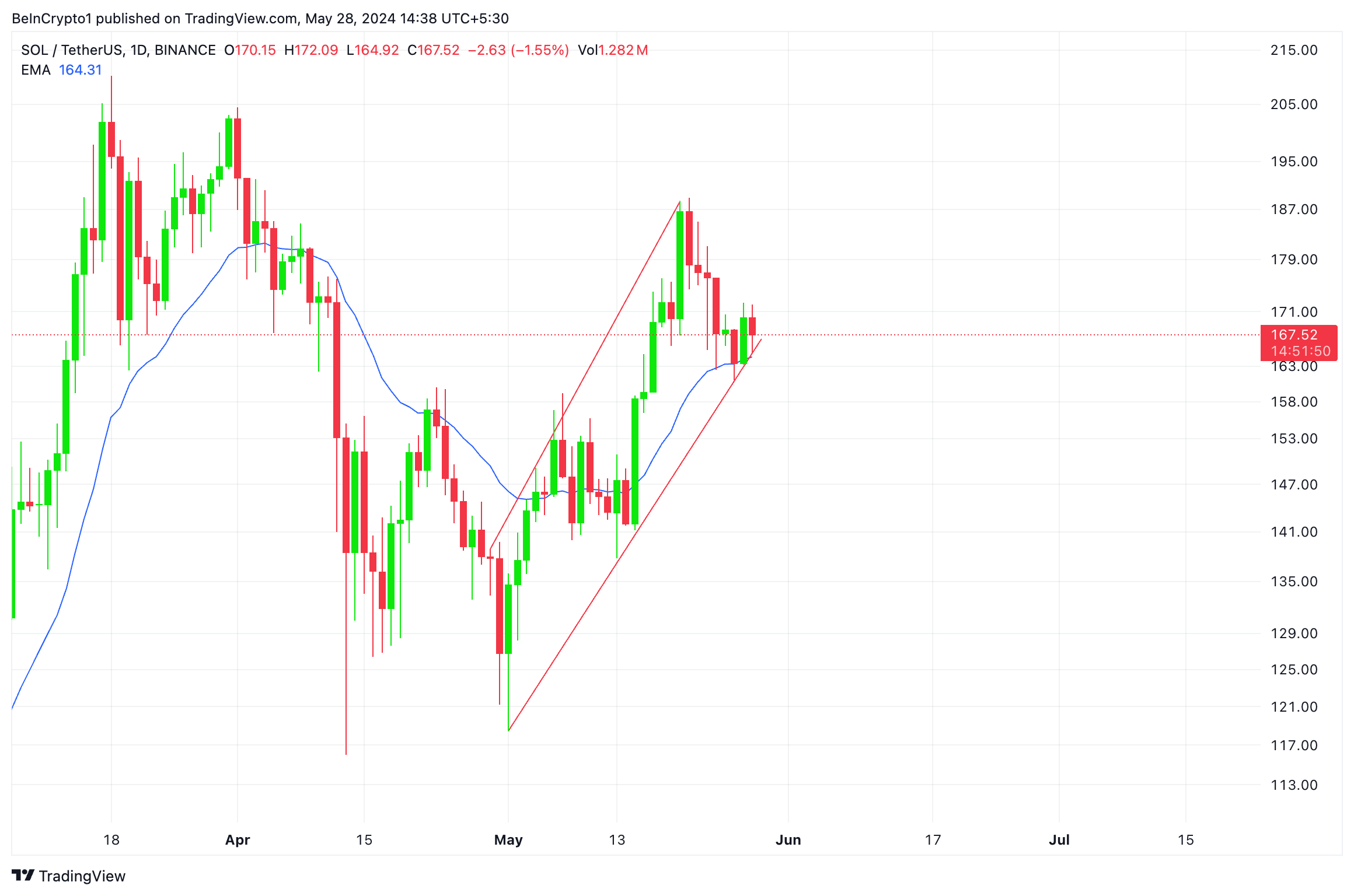 SOL’s move in an ascending channel began when it initiated an uptrend on April 30. On that day, the altcoin traded at $129. By May 20, its value had risen to a peak of $184, after which selling activity began.
