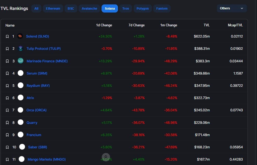Decentralized lending and borrowing platform Solend, for example, has fallen by more than 8% in the last month, while yield aggregation platform Tulip has also shed more than 11% of its TVL within the same timeframe.