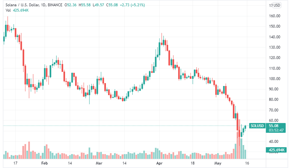 SOL opened the year with a trading price of $170.31, reached a yearly high of $179.43 on Jan. 2, and closed on May 15 at $55.38. Overall, this equates to a 67% decrease in the price of SOL since the start of the year.