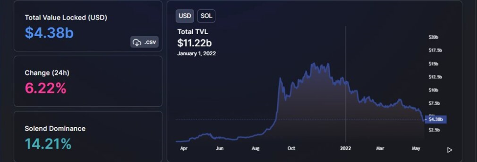 Solana total value locked (TVL) continued to plunge in the third week of May due to bearish trends in the market that have seen declining interest in decentralized finance (DeFi).