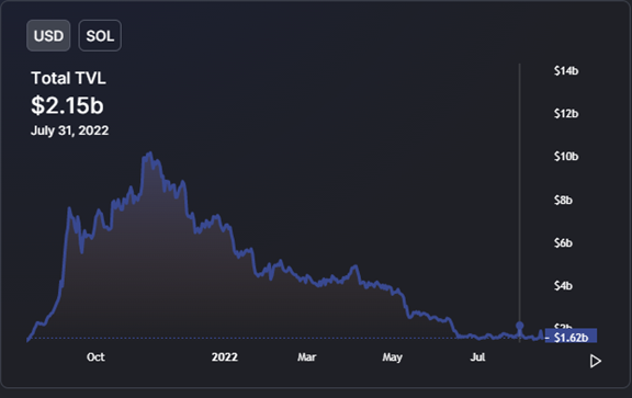Solana has been one of the best-performing smart contract chains in the last two months. The blockchain was up by 38% from $1.55 billion on July 1 to $2.15 billion on July 31, according to Be[In]Crypto research based on data from DeFiLlama.