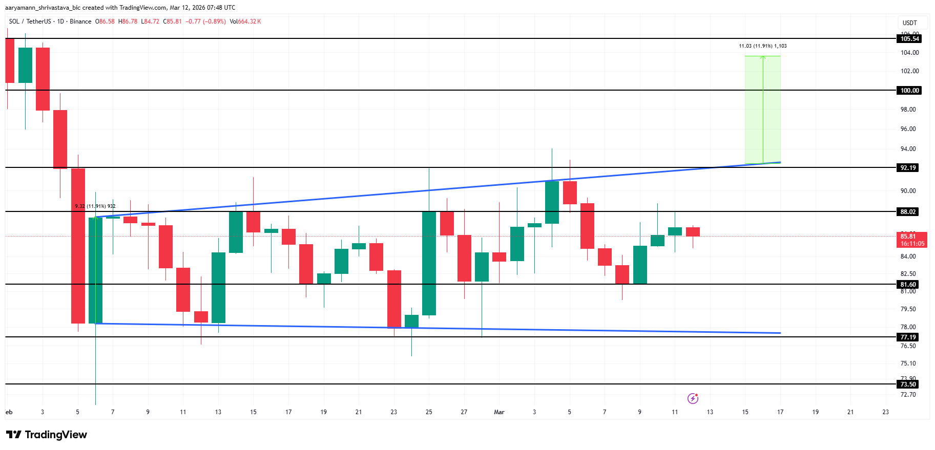 Solana price is trading at $85, moving within a broadening bottom pattern that projects a near 12% rally. The technical breakout level sits at $92, above which the pattern’s full upside target of $100 comes into play. Current price positioning places SOL in a favorable zone for this setup to develop.