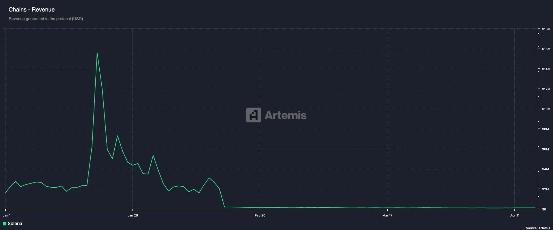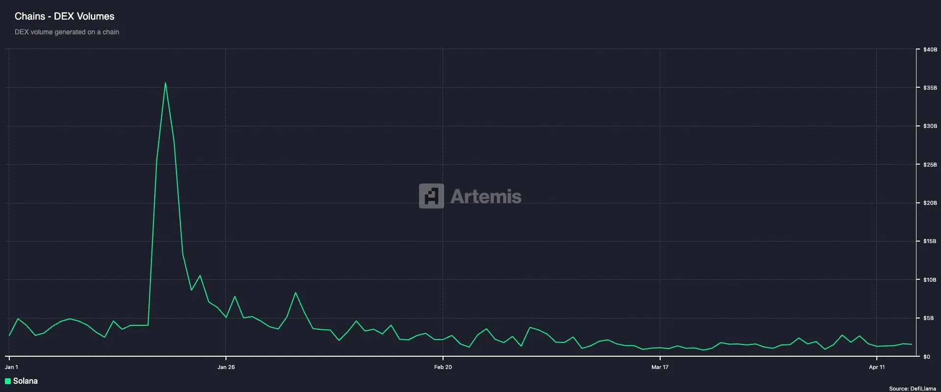 For example, SOL’s DEX volume hit an all-time high of $36 billion on January 19. But as the meme coin hype cooled off, by January 31, it had plummeted to just $3.8 billion, dropping nearly 90%. As of April 15, this totaled $1.5 billion.