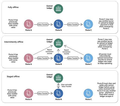 It can support instant peer-to-peer value settlement with or without an intermittent connection to a central ledger. An alternative architecture could enable offline value transfer, which the central bank settles online.