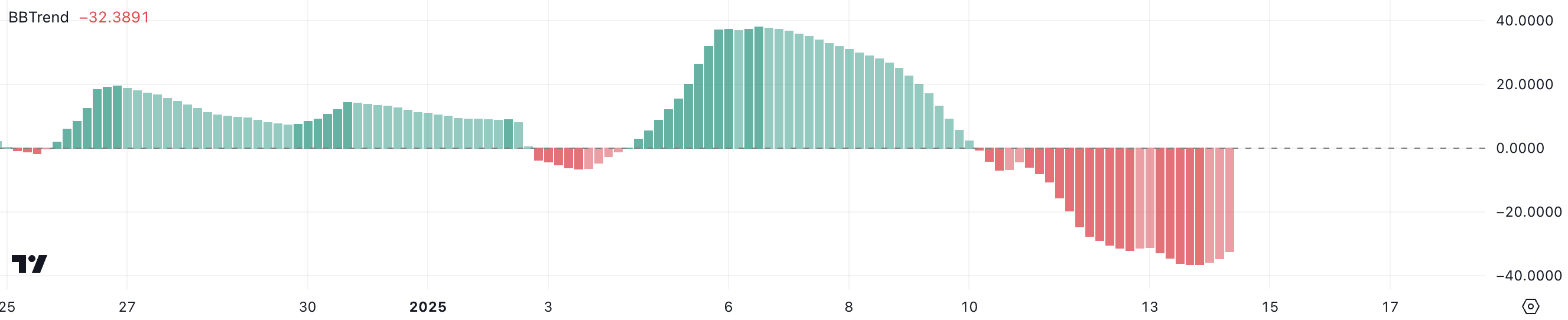The BBTrend, or Bollinger Band Trend, measures price deviations relative to its Bollinger Bands, providing insights into trend strength and direction. Negative values typically indicate bearish conditions, while positive values suggest bullish trends. With SPX’s BBTrend at -32.3, the current reading emphasizes that the asset is still in a bearish zone.