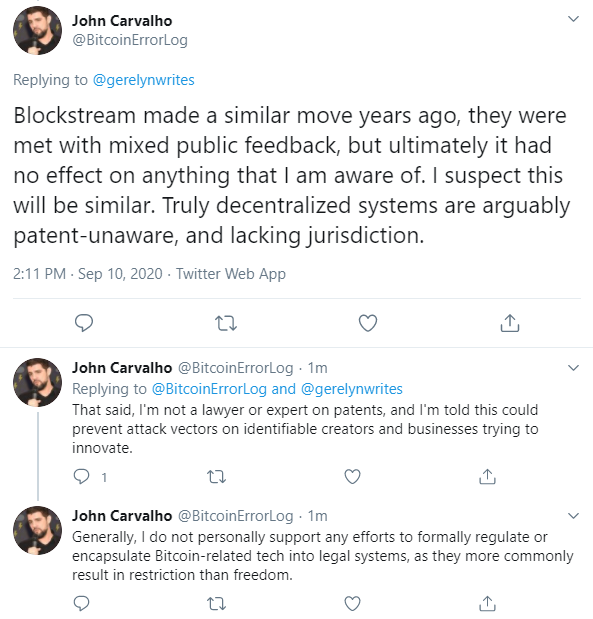 BeInCrypto reached out to Jack Dorsey for a comment, but we didn’t hear back (we’ll update this story if that changes.) We also wrote to John Carvalho, whose Twitter account describes him as a GitHub Outlaw. Carvalho provided us with some context on Square Crypto’s new patent library, comparing it to a similar move by Blockstream back in 2016. At the time, the company adopted what it described as a “defensive patent strategy,” one whose mission resembles that of Square Crypto.