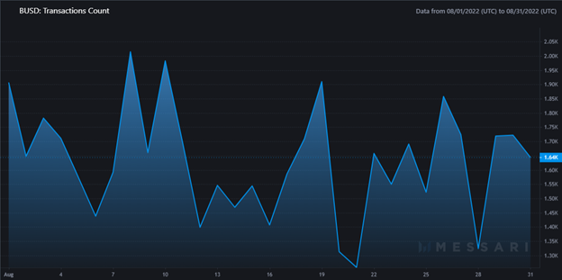 BUSD adjusted on-chain volume for August was $21 billion, corresponding to 2% of total volume. BUSD transaction count clocked in at 50,561.