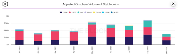 Despite volume plunging to $668 billion in July, the adjusted on-chain volume of stablecoins reached a peak of $866 billion in August. USDC, USDT, DAI, and BUSD made up a majority of the volume.