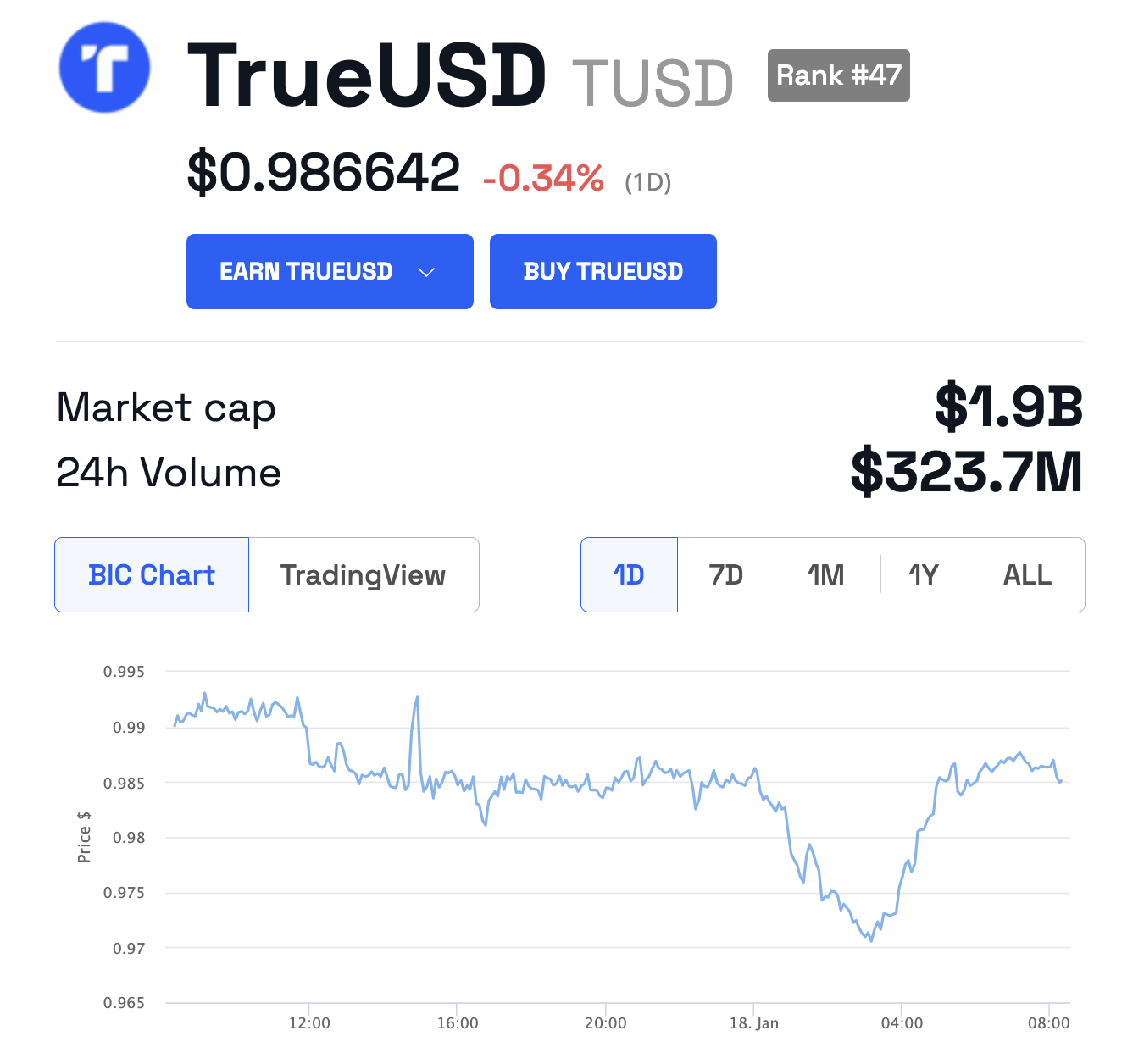 The market capitalization of TrueUSD is $1.9 billion, making it the fifth-largest stablecoin after USDT, USDC, DAI, and FDUSD. The price of the token had not yet recovered to $1 at the time of writing.