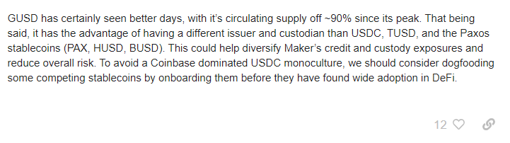 It’s not that GUSD is the most in-demand stablecoin. But fortunately for Gemini, the Maker Governance team is looking for diversification: