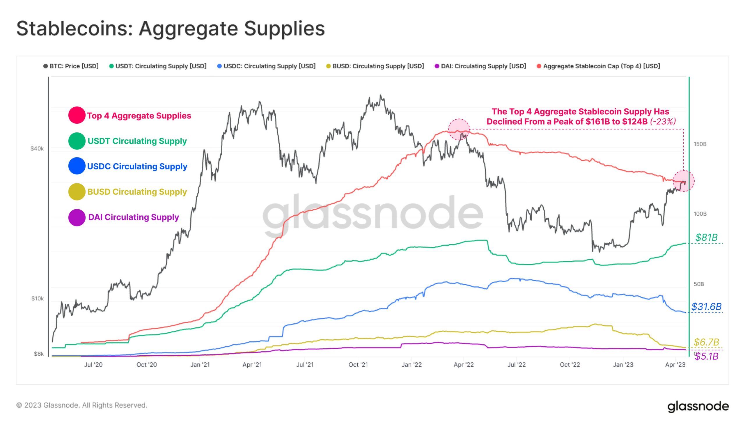 SponsoredAccording to Glassnode, the market capitalization of the top four stablecoins has fallen by $37 billion, or 23% from its peak of $161 billion.