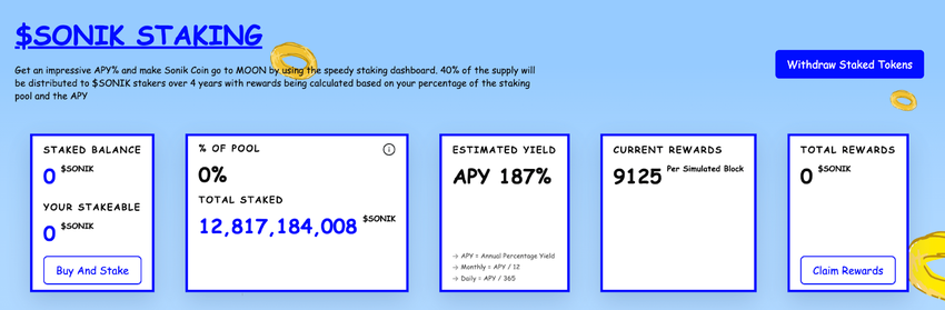 According to Sonik Coin’s staking dashboard, the estimated yield on offer is 188% APY, with over 12.7 billion $SONIK tokens staked already.