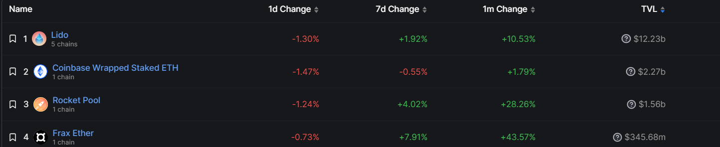 However, its growth pales significantly against rivals like Rocketpool and Frax Ether which increased 27.88% and 43.82% to $1.55 billion and $345 million, respectively.