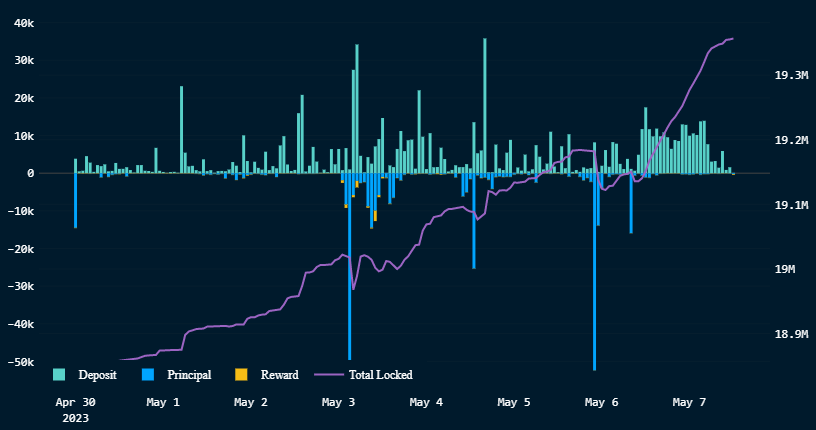 This means there is a positive net flow of 32,000 ETH, pushing the total amount of staked ETH to 19.3 million — roughly 15% of ETH supply.
