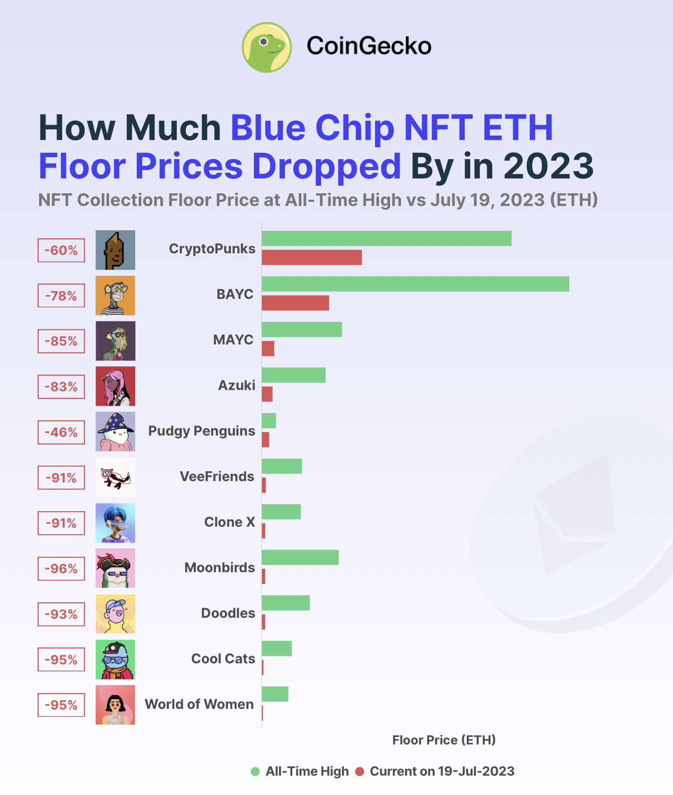 Amidst the vast sea of NFTs, some experienced more profound losses than others. Moonbirds, for instance, suffered the sharpest decline, with floor prices crashing by 95.70% in ETH. Meanwhile, the floor prices of Bored Ape Yacht Club (BAYC) and CryptoPunks, declined by 60.00% and 78.00%, respectively.