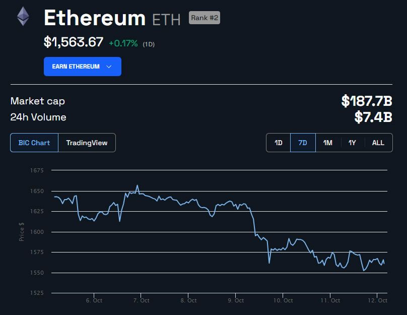ETH is trading flat on the day at $1,561 after falling around 5% over the past week.