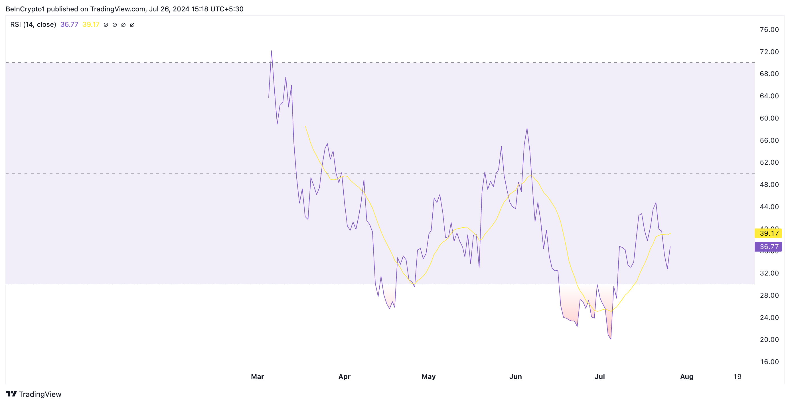 This is due to the steady rise in the altcoin’s selling pressure. As of this writing, STRK’s Relative Strength Index (RSI) is in a downtrend and far from its 50-neutral line at 36.77.