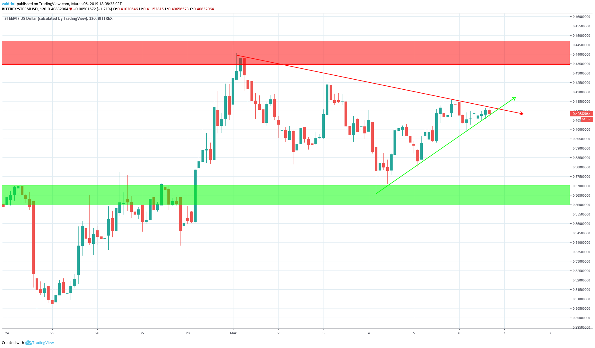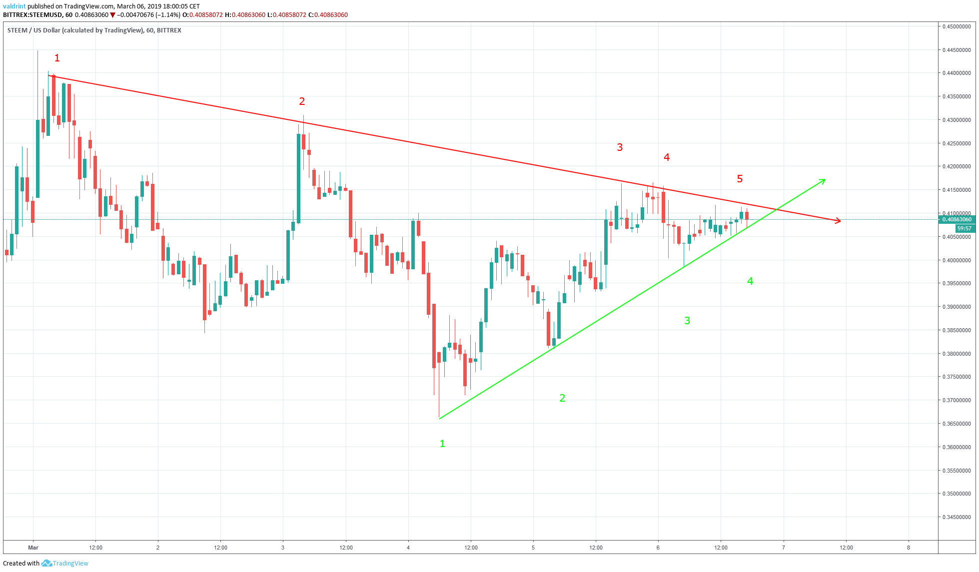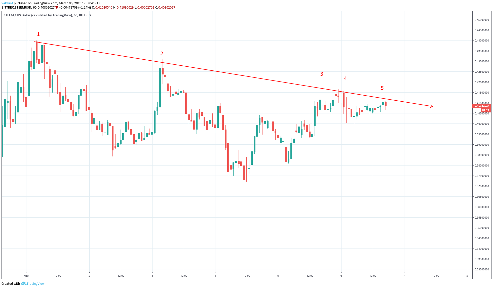 The price of STEEM reached a high of almost $0.45 on Mar 1. It made subsequent lower highs until Mar 6. The descending resistance line is created by tracing the lower highs. The validity of the line increases by the number of times it is touched.