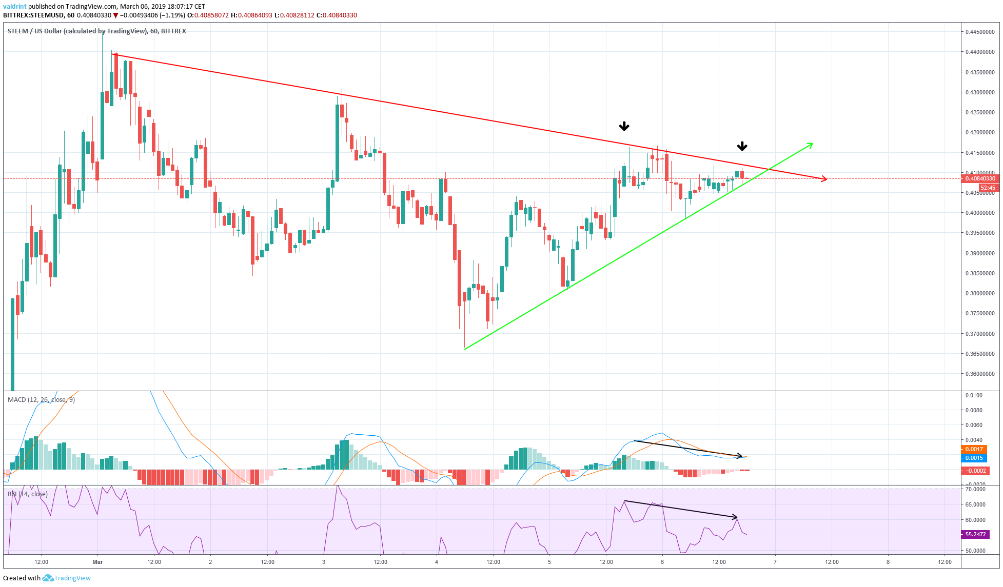 This is called bearish divergence. It often precedes drops in price. In the case of Steem, the amount of divergence was not very significant. This suggests that a drop in price may not be forthcoming and that the price may continue moving upward along the ascending support line.