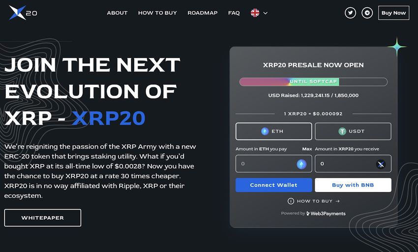 The token’s surging demand has resulted in it raising over $1.2 million in the presale in just over a week. XRP20 is priced at just $0.000092 in the ICO.