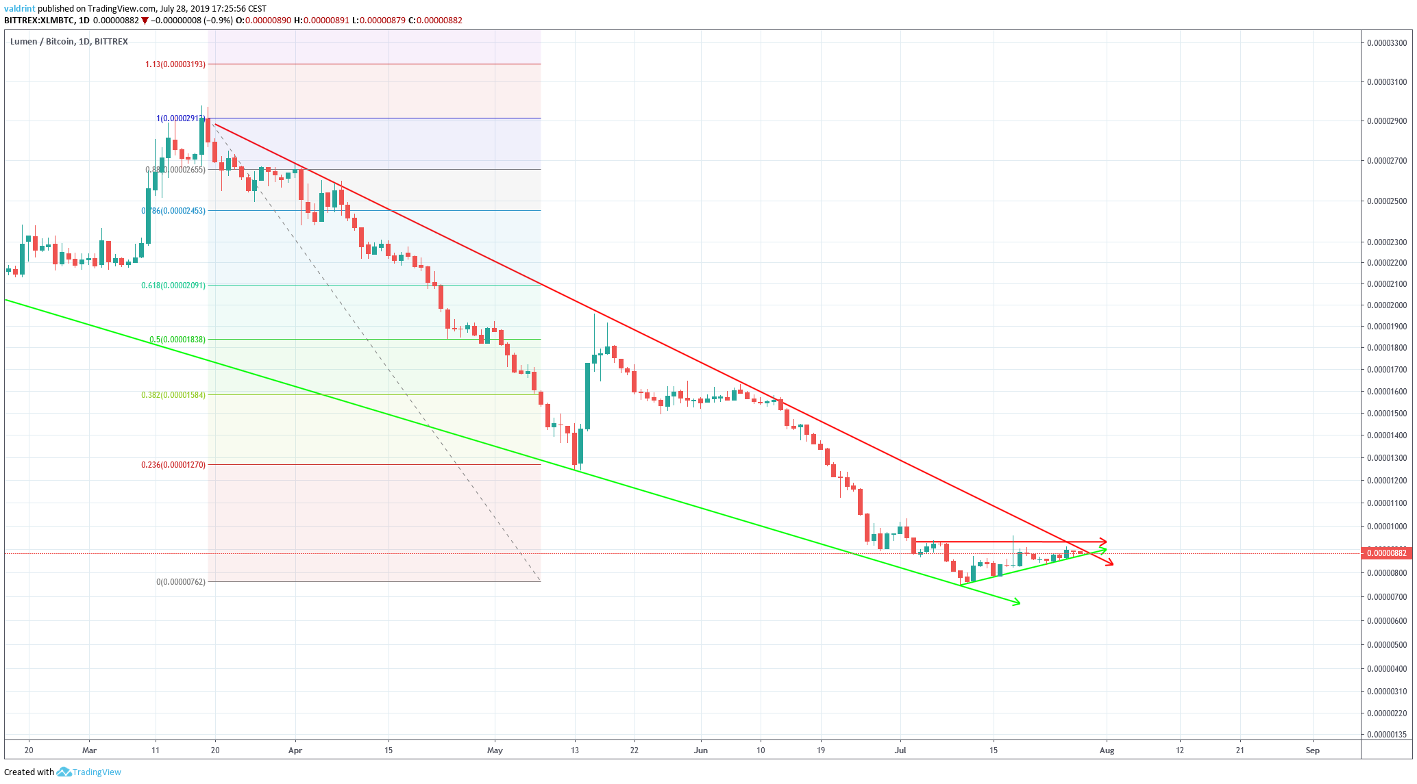 On July 10, 2019, the Stellar (XLM) price reached a low of 749 satoshis. An upward move ensued. On July 18, it reached a high of 957 satoshis. Since then, it has been decreasing, trading inside a range between 850 and 910 satoshis.