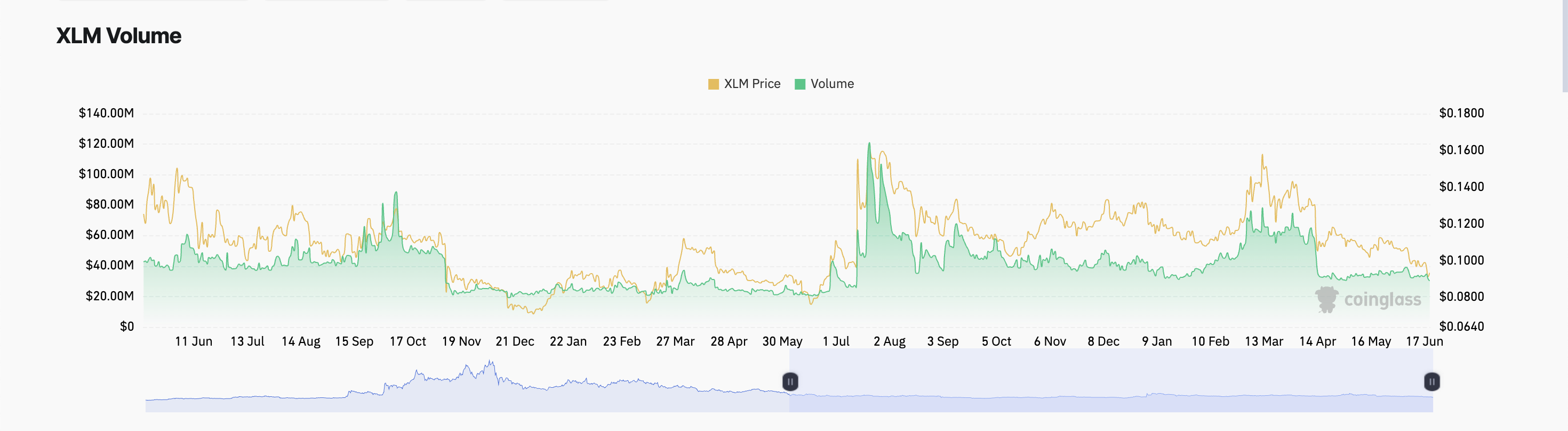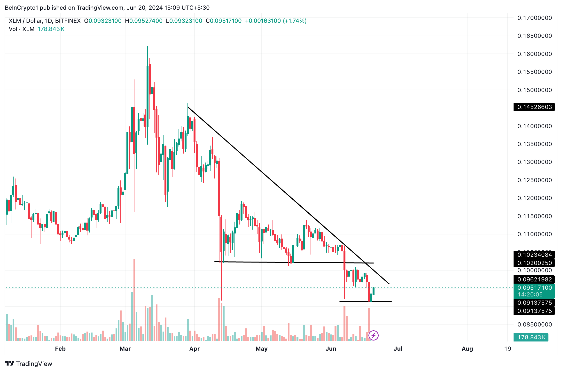 On June 8, XLM dropped below the lower line of a descending triangle, breaching a support level at $0.10 that had held from April 12 to June 7.