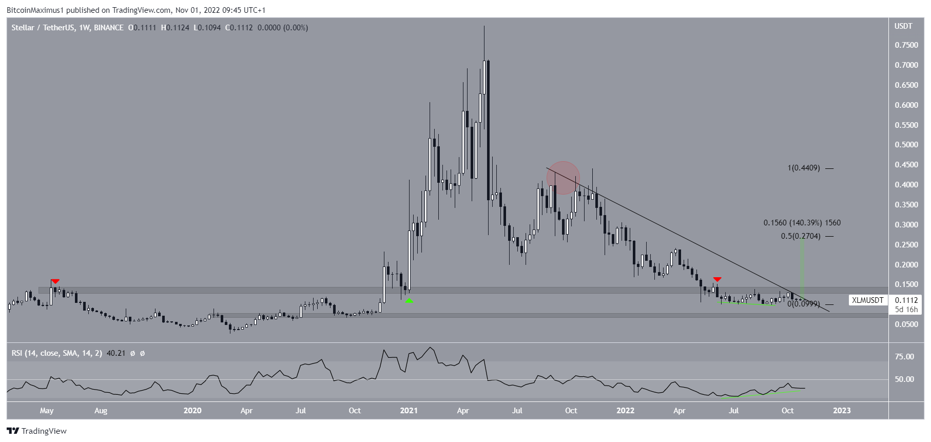 The XLM price has fallen since reaching an all-time high of $0.798 in May 2021. Since Sept. of the same year (red circle), it has fallen underneath a descending resistance line. The downward movement has led to a low of $0.098 in Sept. 2022.Â