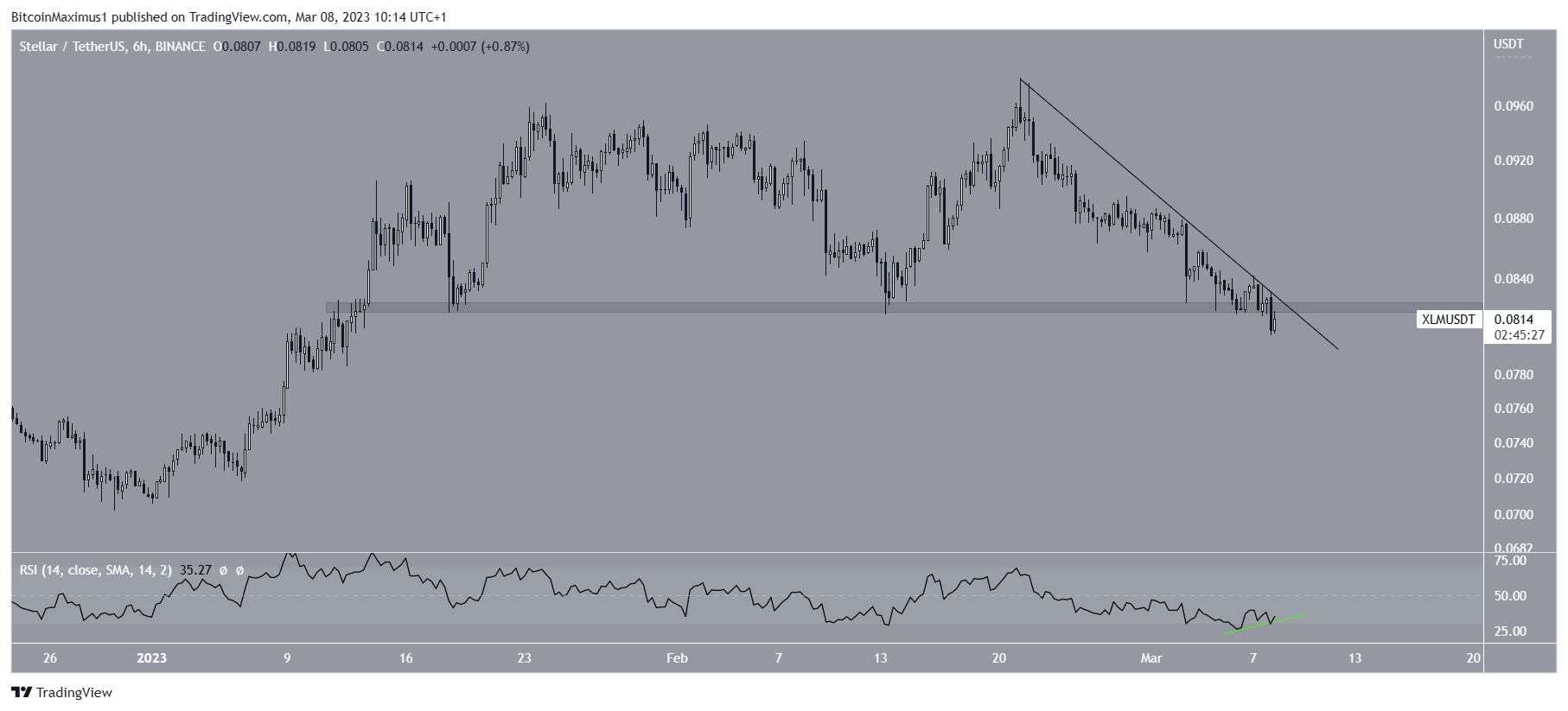 On the bearish side, the Stellar price is falling underneath a descending resistance line and seemingly broke down below the $0.082 area, leading to the lowest price of the year. On the bullish one, the six-hour RSI has generated bullish divergence (green line), a sign that could precede an upward movement.Â