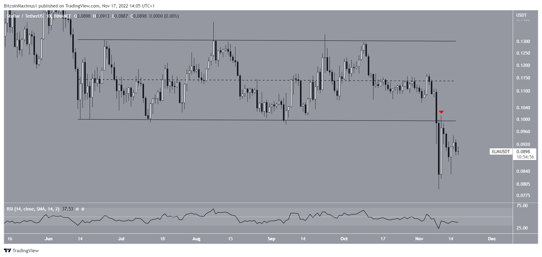 The technical analysis from the daily time frame shows that XLM broke down from a short-term horizontal channel on Nov. 8. It reached a new yearly low of $0.082 the next day.